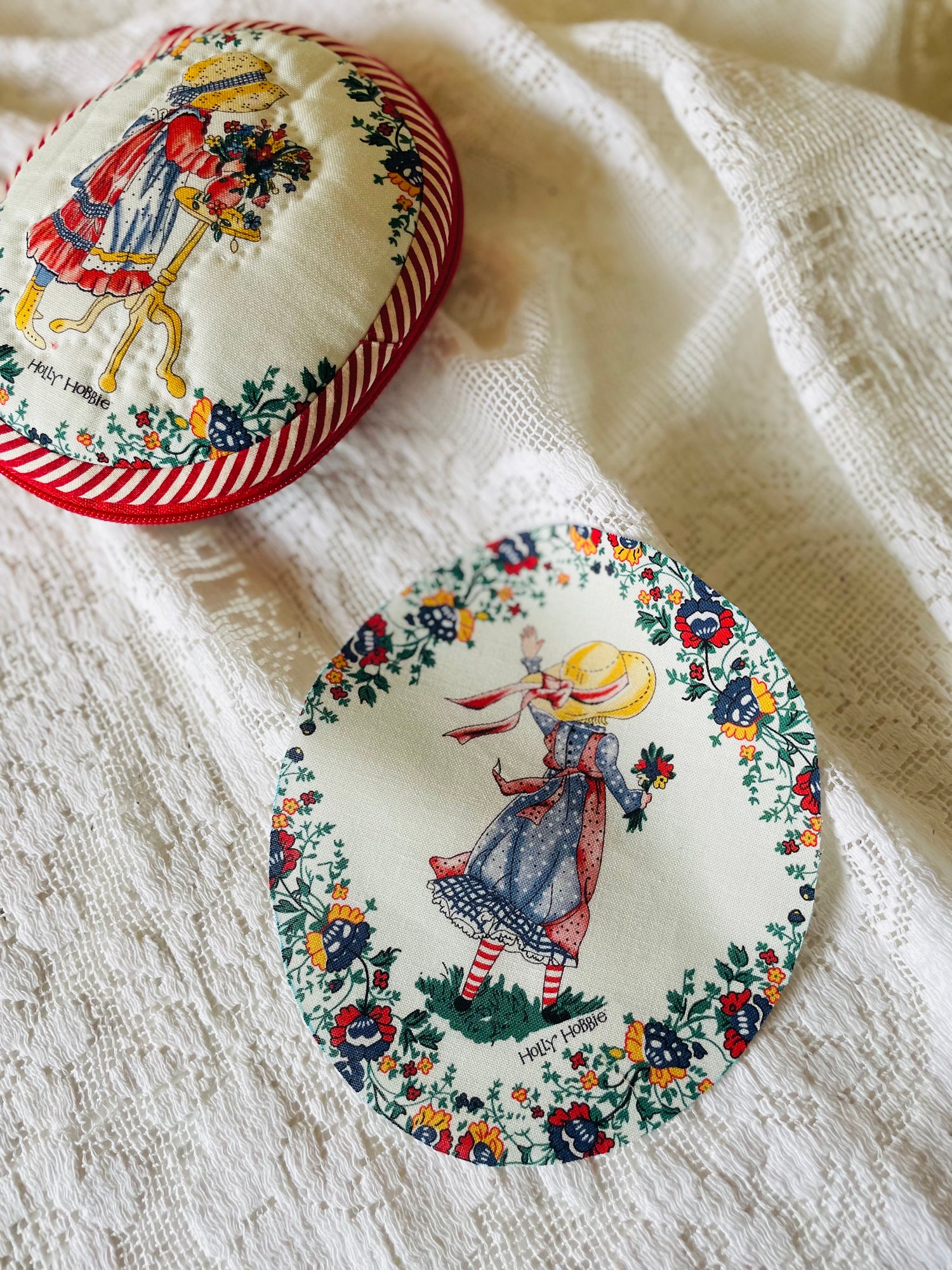 This pouch has a lovely oval shape, featuring adorable Holly Hobbie fabric as the center and a unique interior structure.